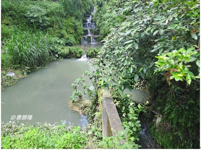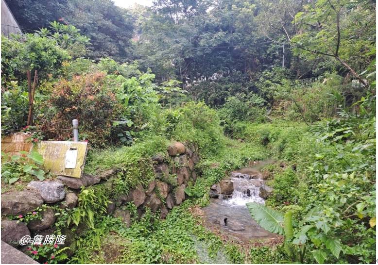 在宫廟旁可見一處瀑布般的潺潺流水,水流聚集於水潭後往下動,但溪流再出現時是松山路臨664之7號旁,再順著山勢往下流,因位逆向坡,大雨來時水流湍急常造成災害,經過大地工程處以生態工法整治,溪底鋪設了石塊減緩流速,溪流變得溫馴,並悠悠流入了永春陂濕地公園。